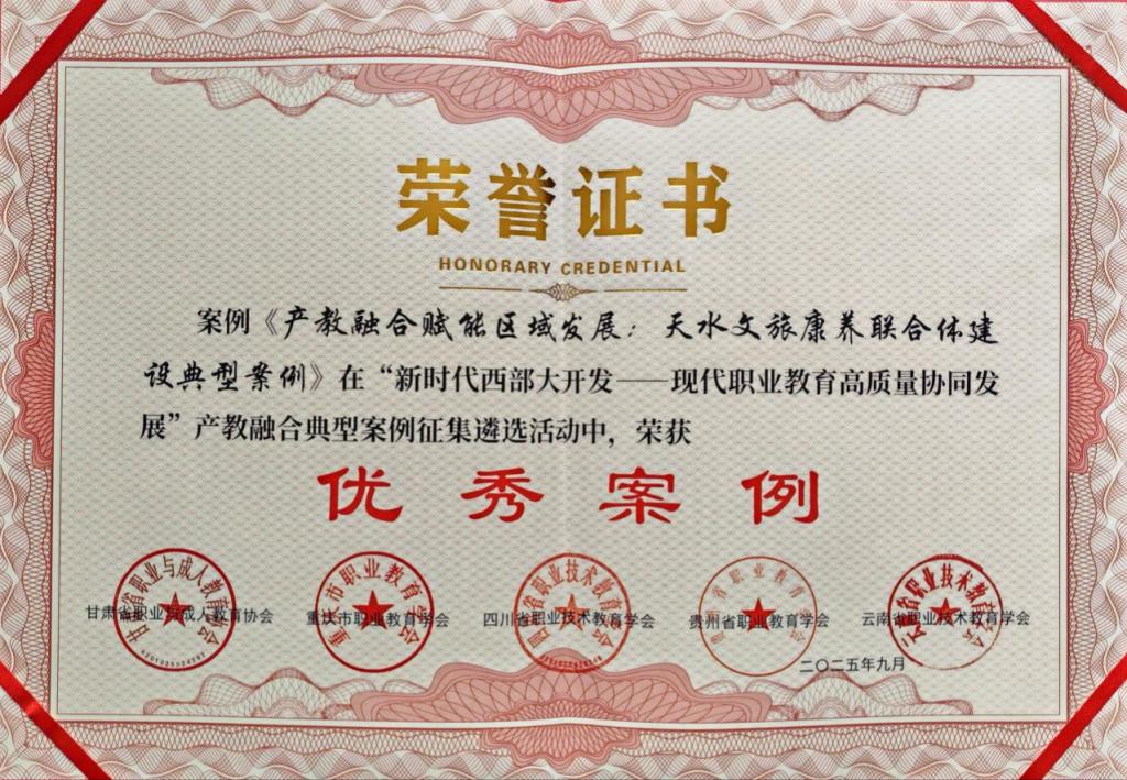 大会表彰了荣获“新时代西部大开发——现代职教之星”的单位、个人及“产教融合典型案例”,集中展示近年来西部五省市在职业教育高质量协同发展中的办学育人成果。我校荣获“创新发展之星职业院校”荣誉,旅游学院李玉林团队撰写的《产教融合赋能区域发展:天水文旅康养联合体建设典型案例》获评“优秀案例”,化工学院教师杨劝生获评“德技双馨之星”荣誉称号。