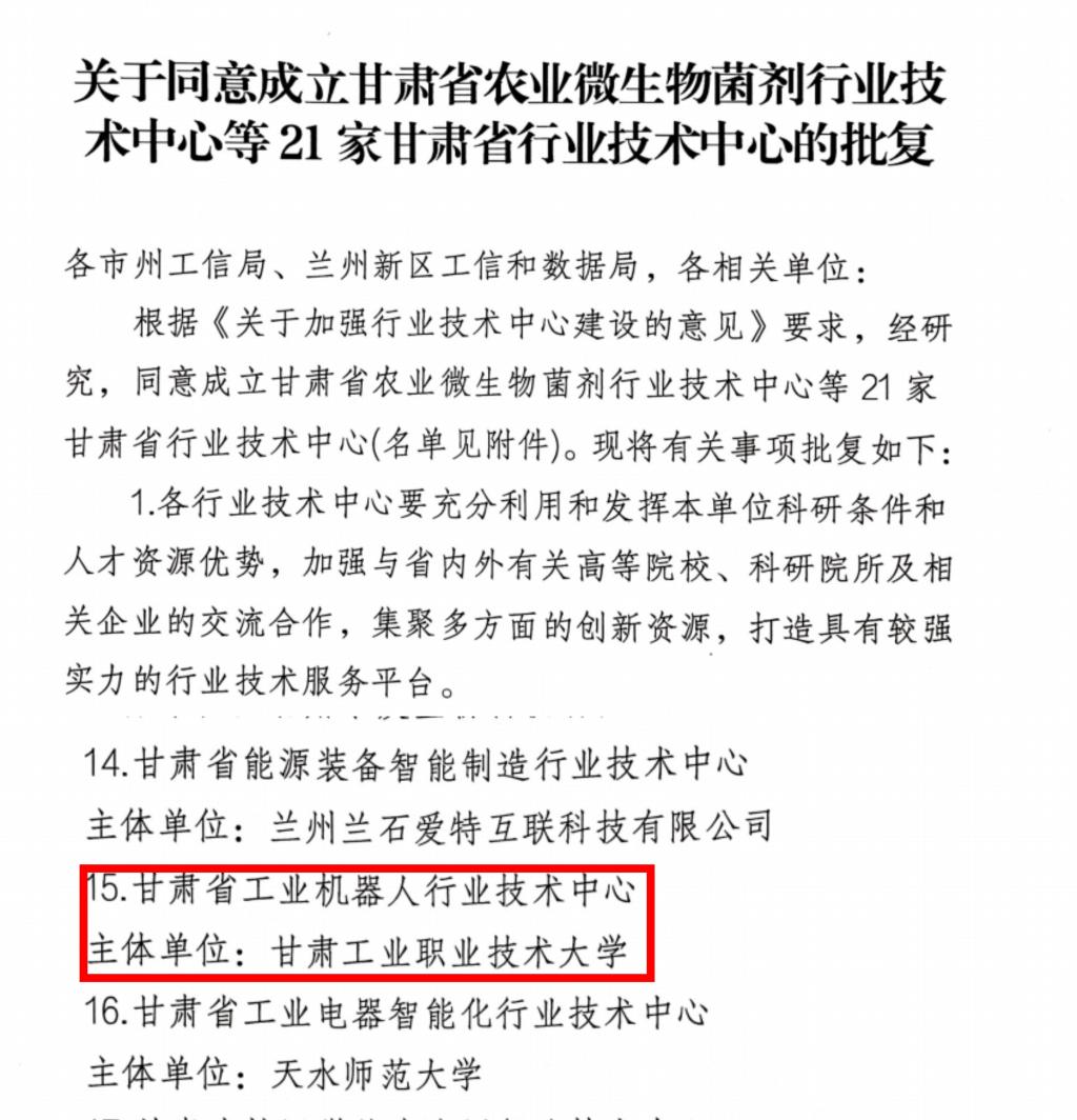 近日,甘肃省工业和信息化厅发布“2025年省级行业技术中心”名单,我校牵头申报的“甘肃省工业机器人行业技术中心”成功获批建设。