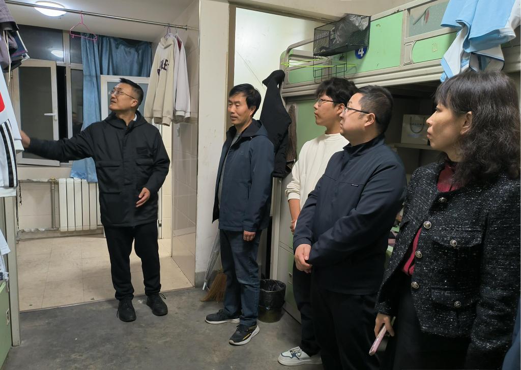 在宿管值班室,坚葆林查阅了值班日志、出入登记及设施报修等情况,详细询问了学生公寓日常管理情况。他强调,要持续增强责任意识、安全意识、服务意识,努力为学生营造温馨、舒适、安全的生活环境。