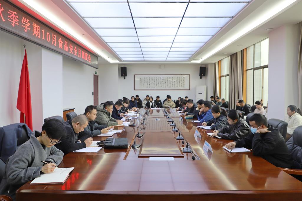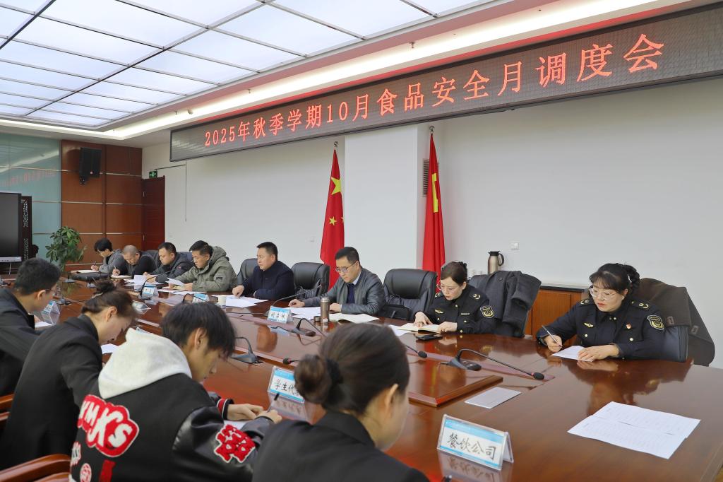 为持续强化校园食品安全管理,切实保障师生饮食安全与身体健康,10月22日,我校在图书馆四楼会议室组织召开了2025年秋季学期10月食品安全月调度会议。学校党委副书记、校长张利军出席会议并讲话,花牛镇市场监督管理所副所长易蓉蓉应邀到会指导。学校后勤管理处、校饮食服务中心、各餐饮承包公司和大宗食材供应商部门负责人以及校学生会生活权益部学生代表共同参加了会议。会议由副校长胡森林主持。