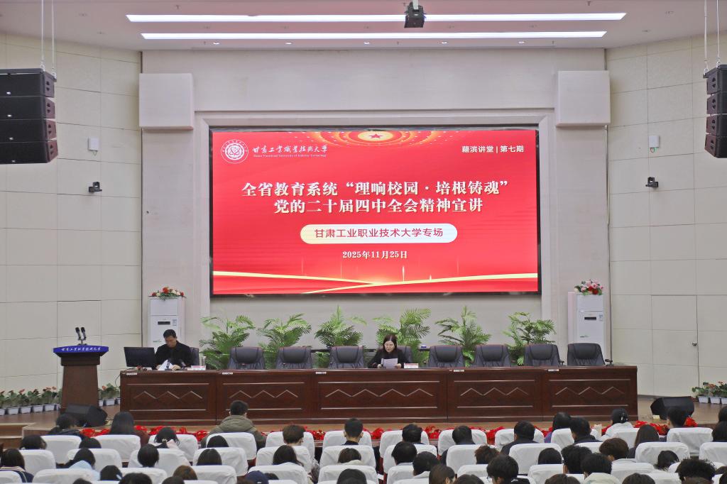 11月25日,学校在麦积校区图书馆五楼报告厅成功举办第七期“藉滨讲堂”——全省教育系统“理响校园·培根铸魂”党的二十届四中全会精神专场宣讲会。本次活动特邀省委教育工委宣讲团成员、甘肃林业职业技术大学马克思主义学院党总支书记郭三龙教授作专题辅导报告。学校党委常委、副校长张庆华主持宣讲会,思政课教师代表、各学院学生代表等300余人参加学习。