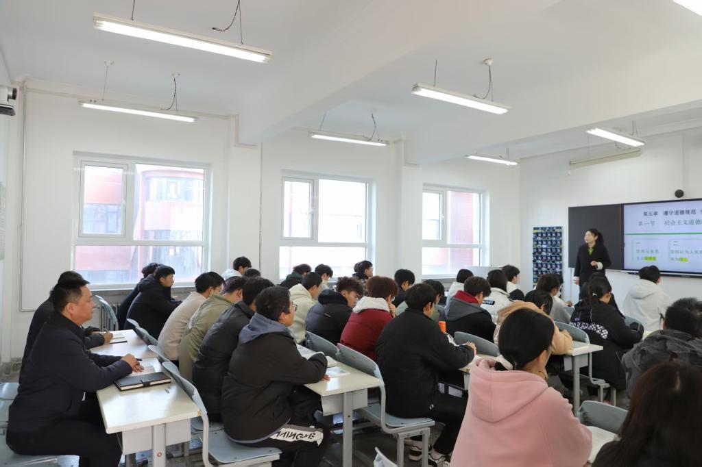 党委副书记、校长张利军走进李杨老师的《思想道德与法治》课堂。李老师围绕“为人民服务”的社会主义道德核心与“集体主义”基本原则,结合新时代志愿服务典型案例与职业教育特色,系统阐释理论内涵,使抽象的道德理念生动可感。张利军对课程给予充分肯定,指出课程紧扣教材核心、逻辑清晰,强调要深化理实融合,将道德规范与学生职业发展、社会需求紧密衔接,助力学生筑牢服务信念与集体观念。