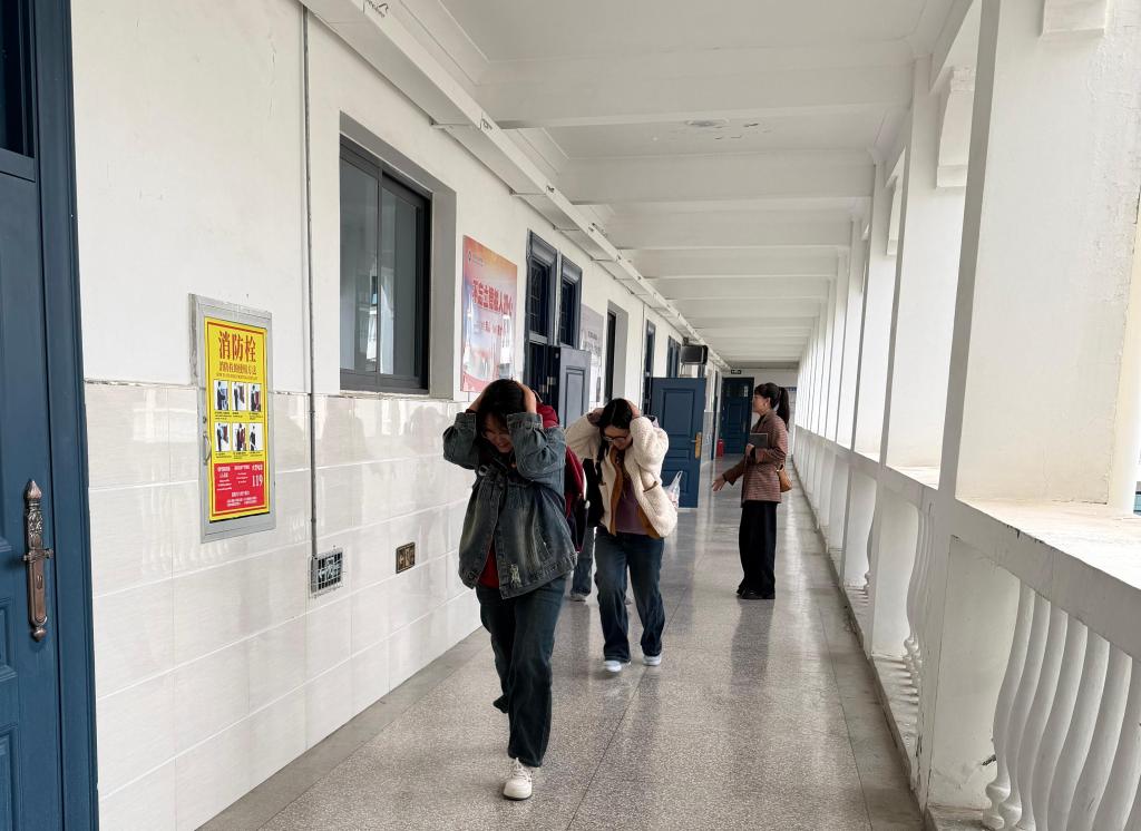 随着演练提示响起,学生们迅速蹲下,双手抱头或用书本等遮住头部,依靠桌子掩护,在辅导员和班主任指挥下,迅速有序地从楼梯进行紧急疏散,用最快的时间“撤离”教室和宿舍,前往学院指定的“安全地带”。整个过程紧张规范有序,教学楼和宿舍楼梯口都安排有老师维持秩序,全院学生两个场景全部疏散完毕分别用时2分33秒(教室)和3分52秒(宿舍)。